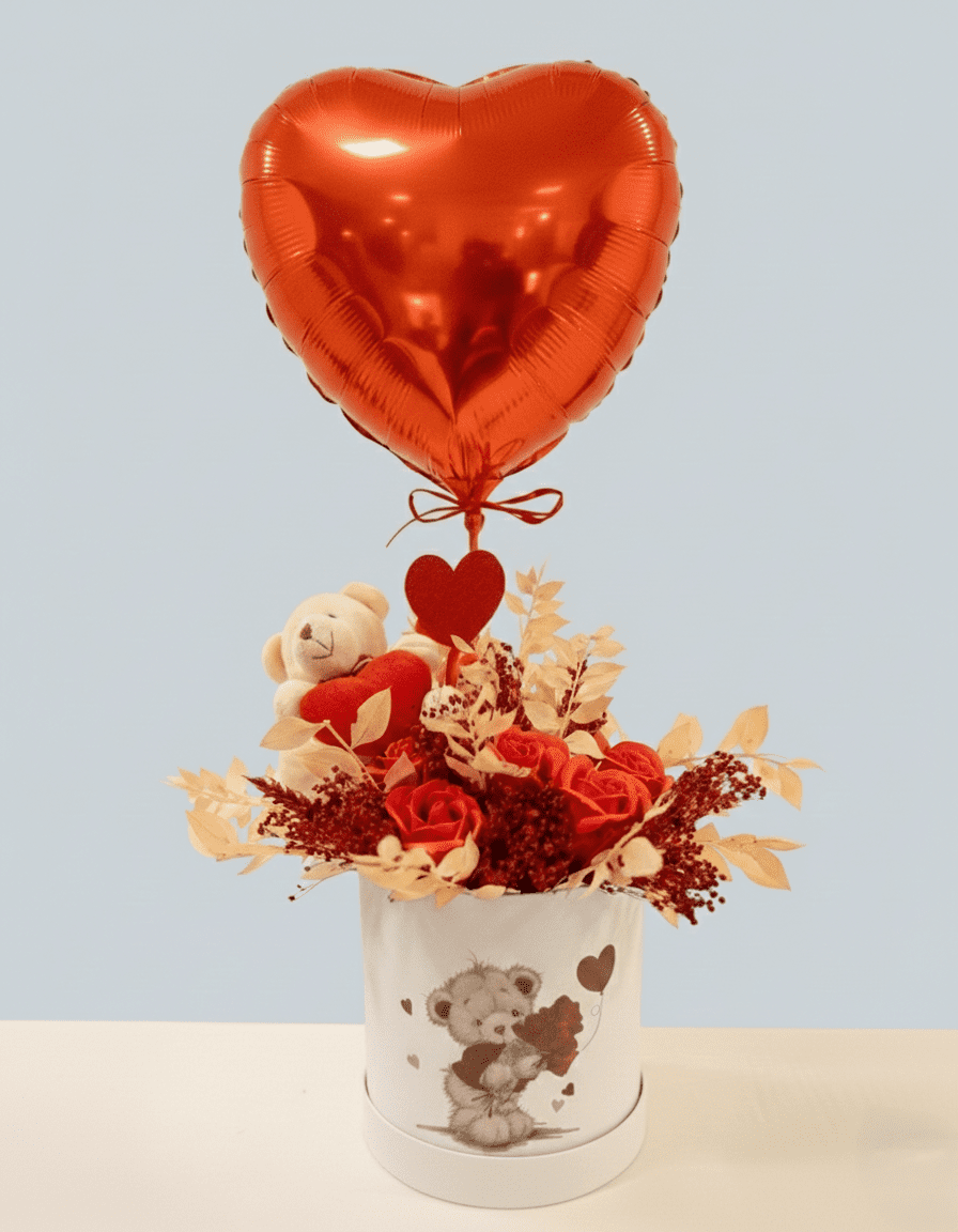 Arranjo em base branca com ilustração de urso, incluindo um balão em formato de coração, urso de peluche com coração, rosas vermelhas e folhagem seca abundante em tons naturais e vermelhos.