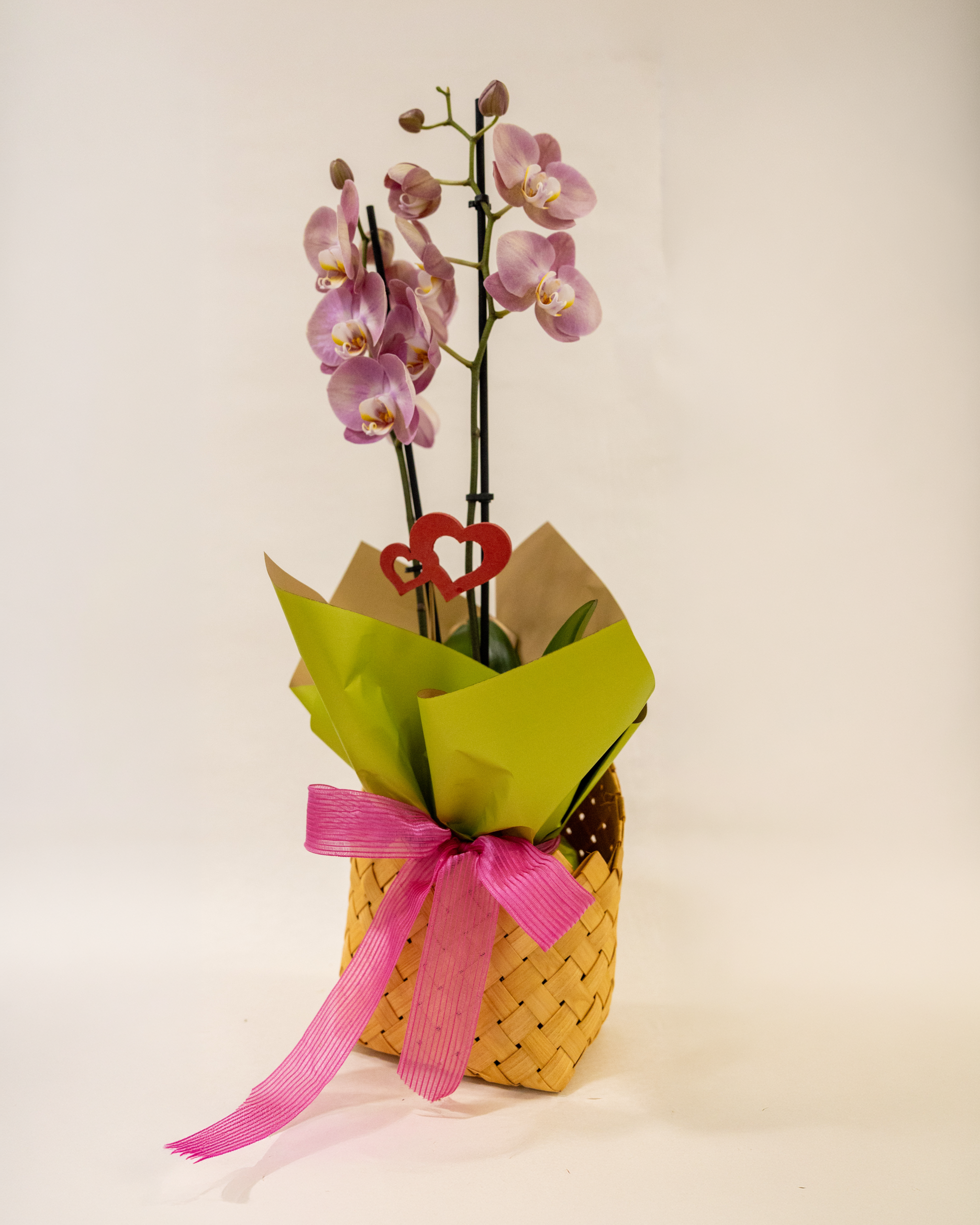 Orquídea rosa em cesto de verga natural, envolvida em papel decorativo verde e finalizada com laço rosa vibrante e detalhe de coração.