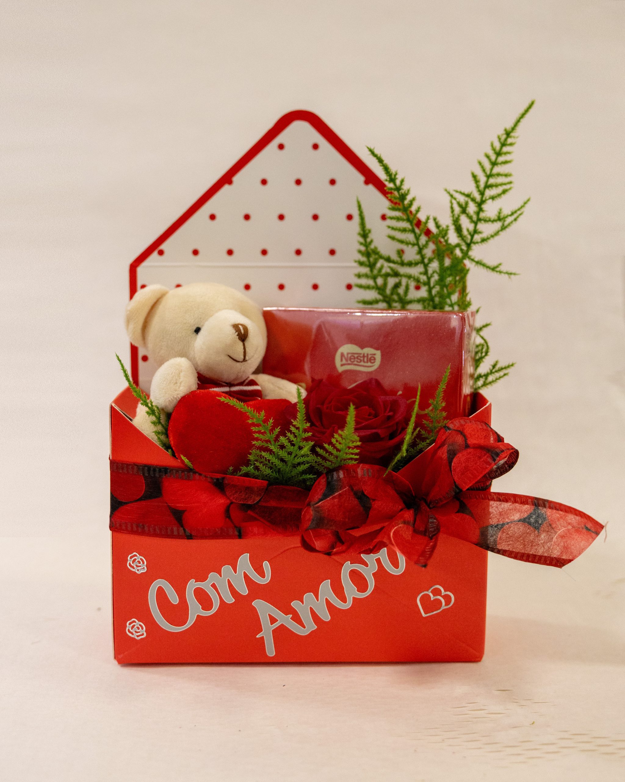 Arranjo em caixa vermelha decorativa, com a mensagem “Com Amor”, com urso de peluche, rosa vermelha, chocolates da Nestlé, verdes decorativos e laço em tons de vermelho. Um presente apaixonante que combina ternura e sabor.