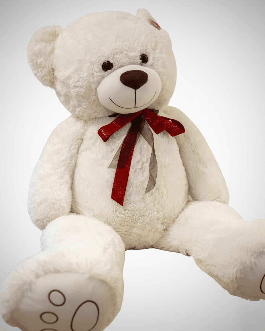 Urso de peluche branco pérola de grande dimensão, com laço decorativo vermelho ao pescoço. Um presente clássico, macio e cheio de carinho, perfeito para transmitir amor de forma inesquecível.
