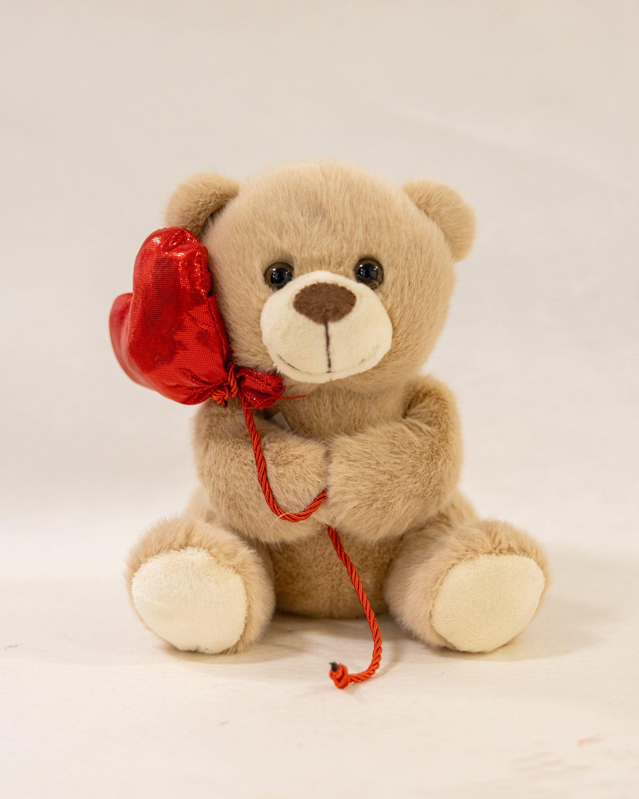 Urso de peluche castanho claro de textura aveludada, segurando um balão em formato de coração vermelho brilhante.