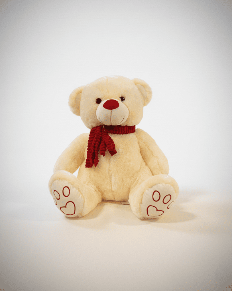 Urso de peluche pequeno bege de toque macio, com nariz vermelho e cachecol de veludo bordô, apresentando detalhes de corações bordados nas plantas dos pés.