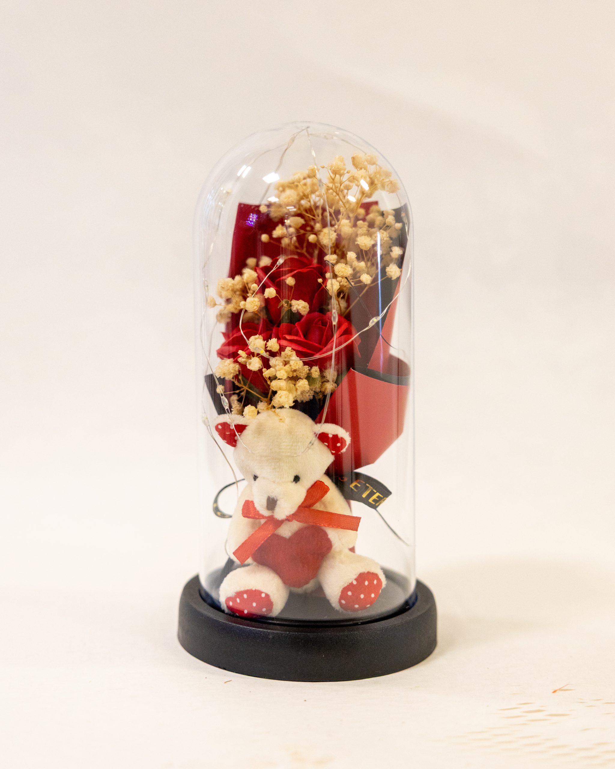 Redoma de vidro com base preta, contendo um mini urso de peluche com coração, um bouquet de rosas vermelhas e flores de enchimento beges, iluminado por uma delicada corrente de luzes LED.