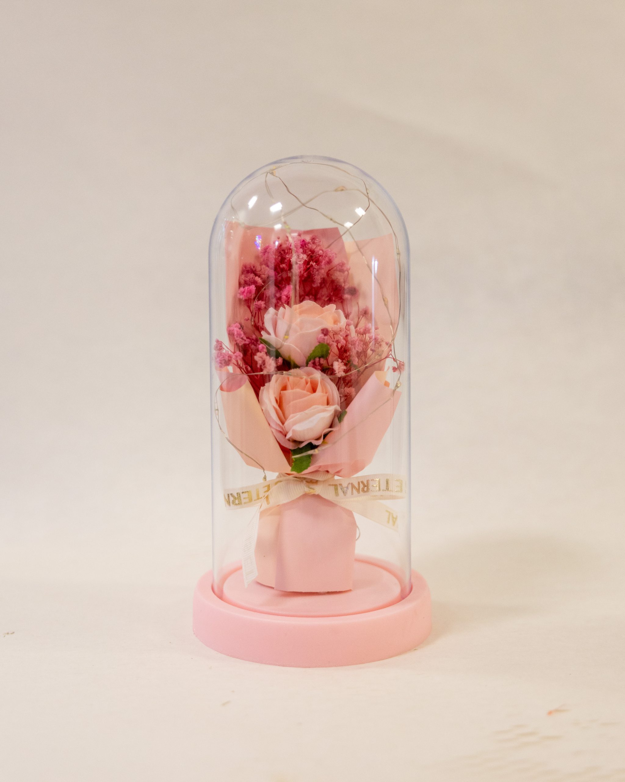 Redoma de vidro com base rosa, apresentando um bouquet delicado de rosas em tom salmão e flores secas rosadas, envolvidas numa fita com a inscrição “Eternal” e luzes decorativas.
