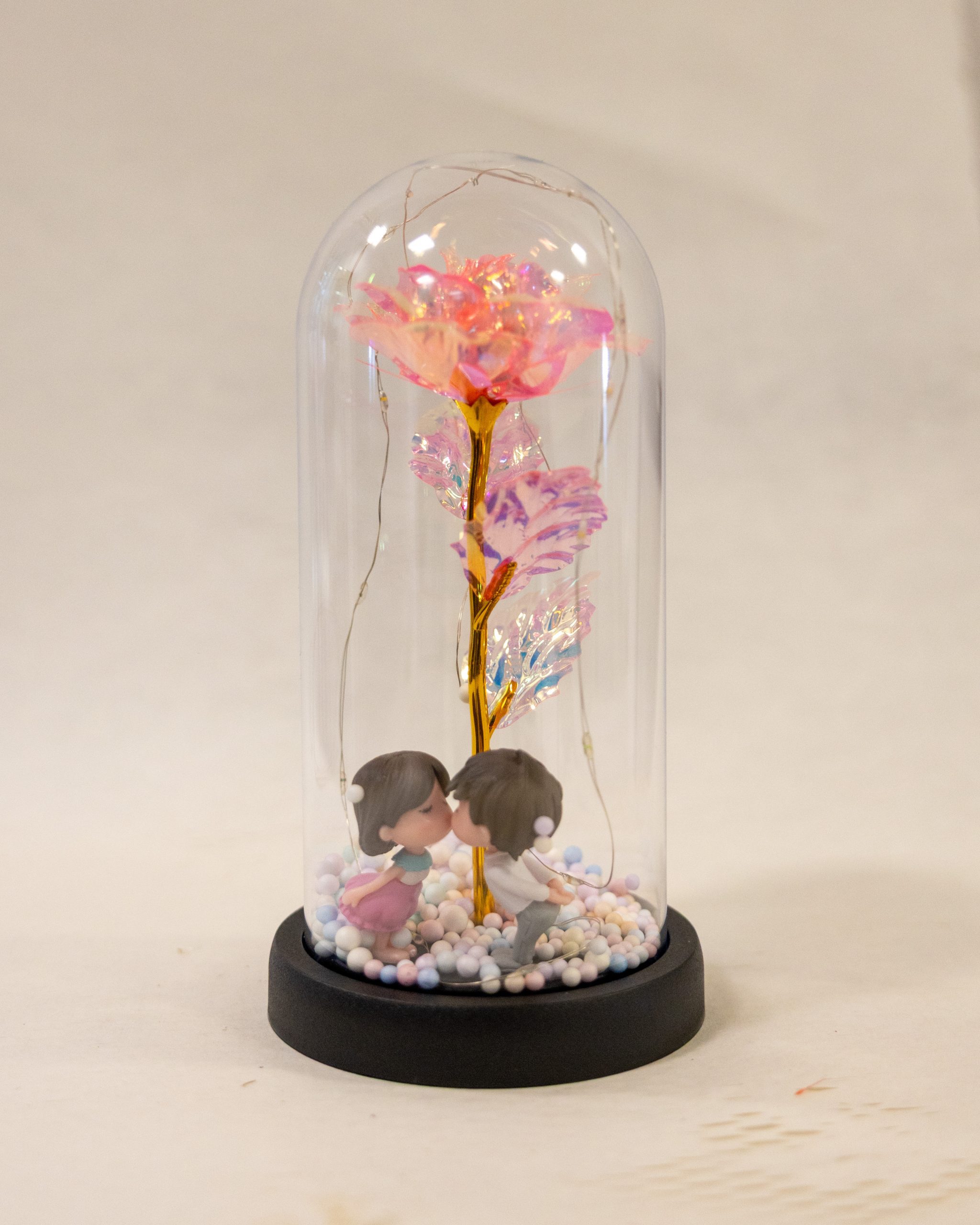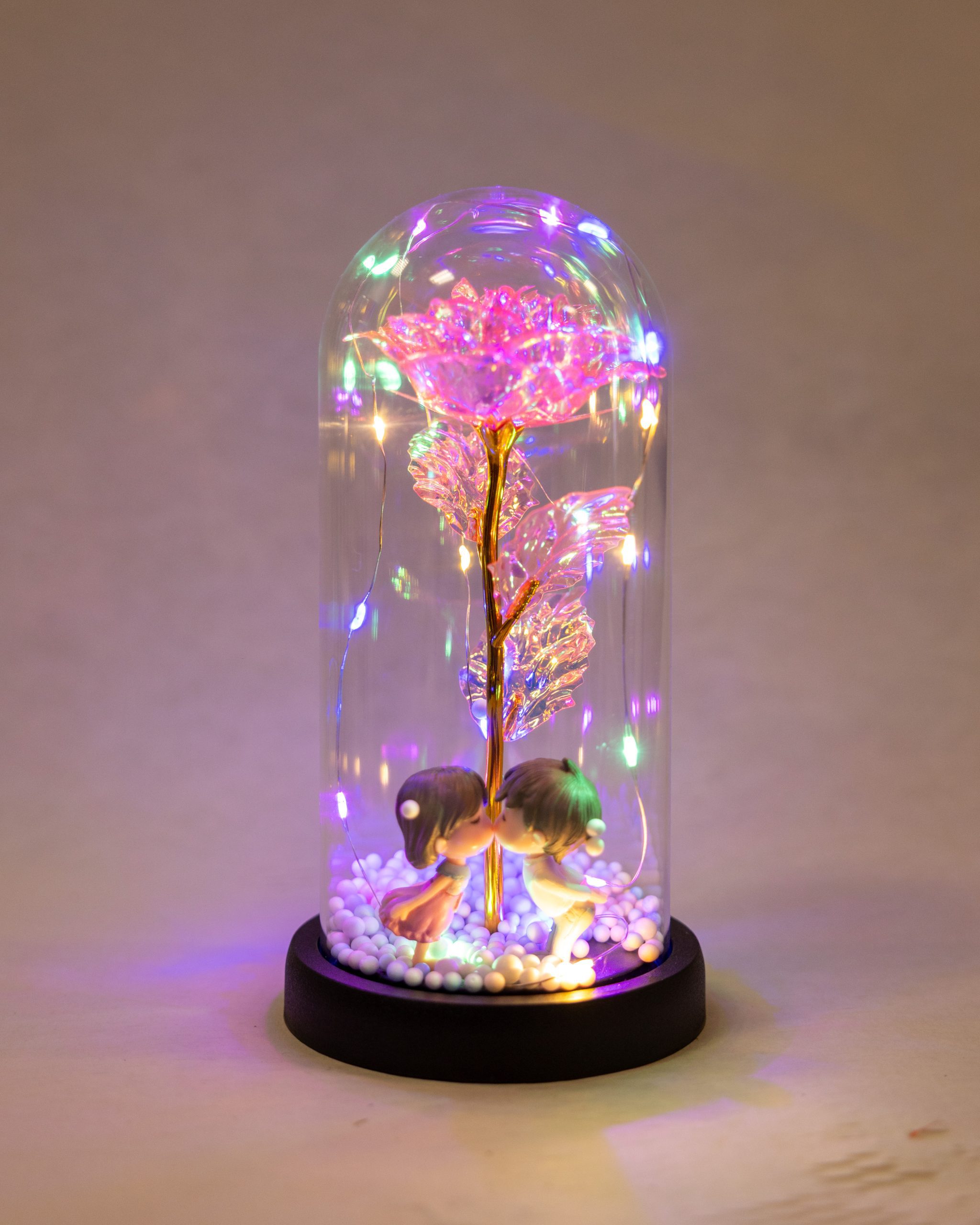 Redoma de vidro com iluminação LED multicolorida, base preta com pérolas decorativas, destacando uma rosa de cristal irisada e figuras em miniatura de um casal.