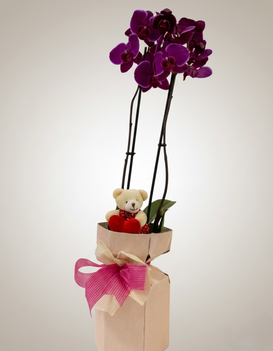 Orquídea de cor púrpura profunda em base de cartão kraft, decorada com um laço duplo em tons de rosa e bege, acompanhada por um pequeno urso de peluche com coração.