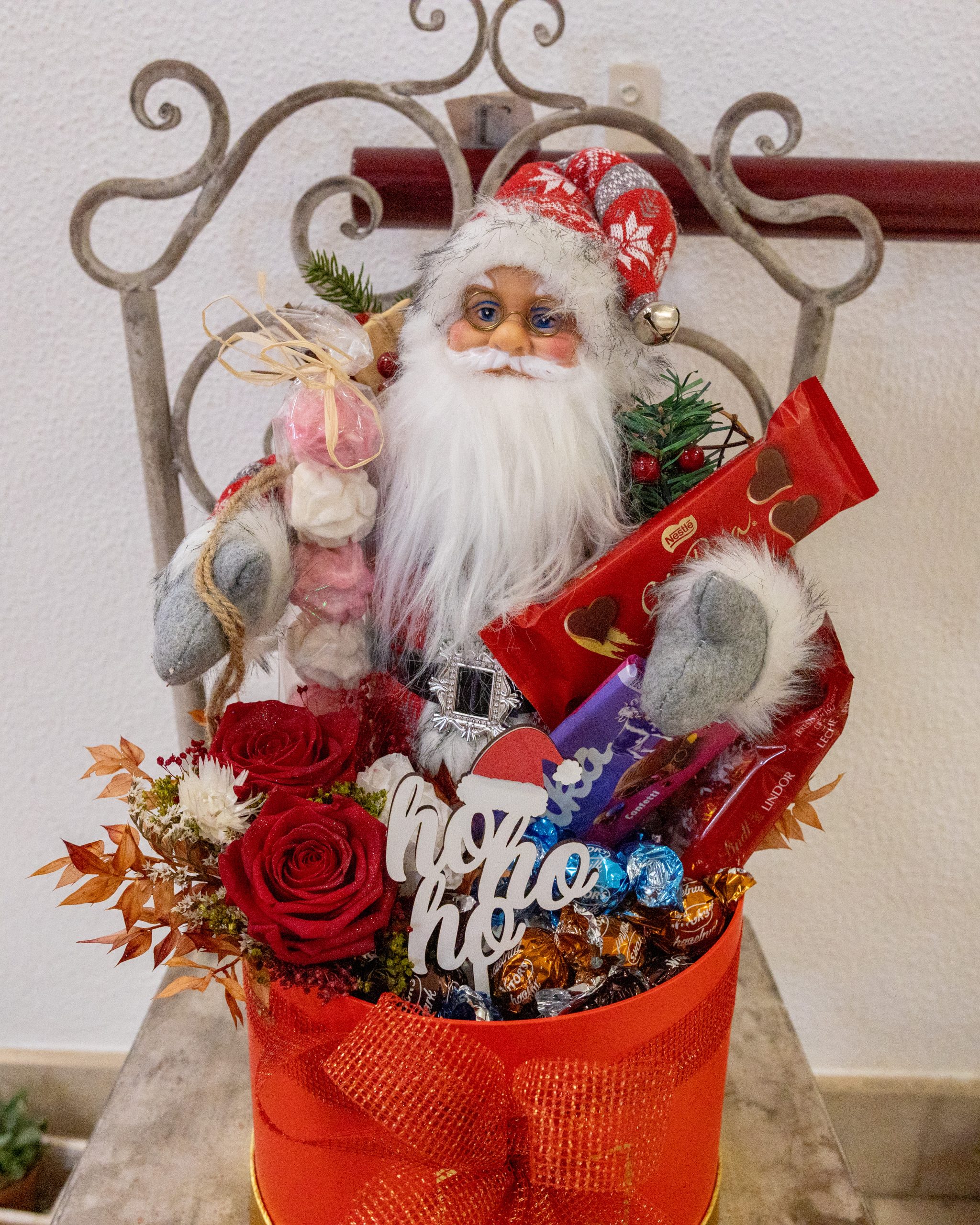 Caixa vermelha com figura clássica do Pai Natal, rosas aveludadas, topper decorativo e mix de chocolates diversos.
