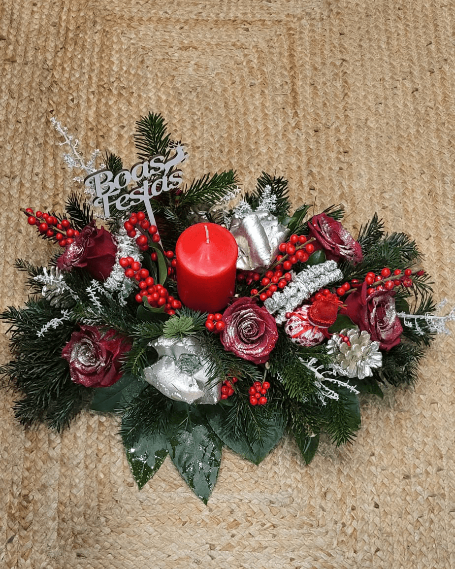 Centro de mesa alongado em base de verdura natural, decorado com rosas vermelhas com apontamentos de neve artificial, pinhas prateadas, bagas vermelhas (azevinho).