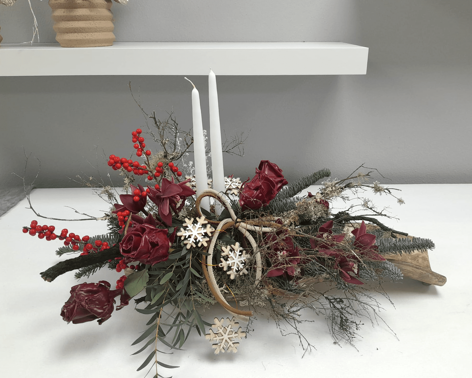 Centro de mesa moderno montado sobre base de madeira natural rústica. Composto por duas velas brancas altas, rodeadas por flores em tons de vinho (bordeaux), ramos de azevinho com bagas vermelhas (ilex) e verdura de pinheiro.