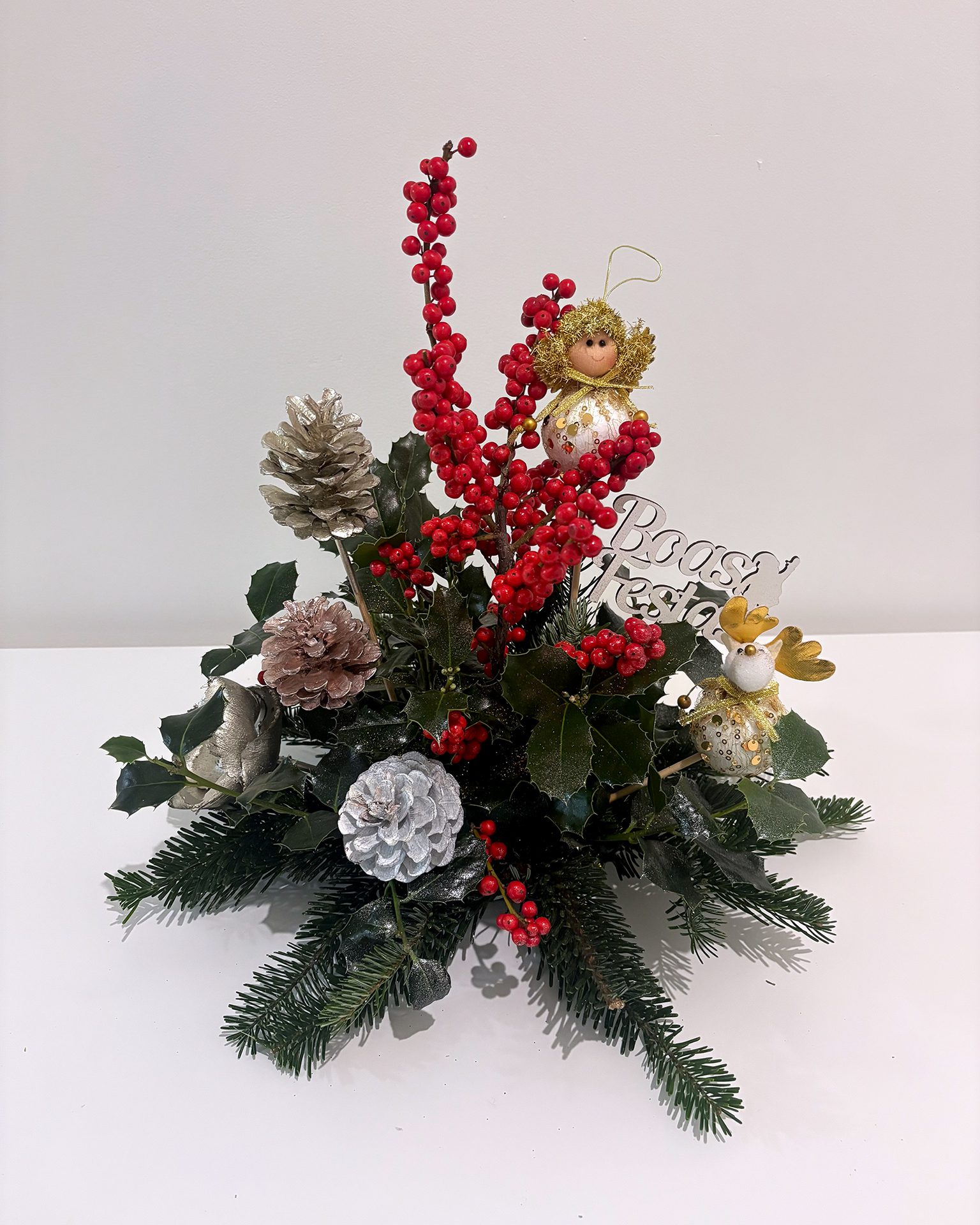 Decoração natalícia exuberante de azevinho e pinho, com bagas vermelhas, pinhas prateadas e dois pequenos anjos dourados. Com a placa “Boas Festas”! Ideal para alegrar qualquer espaço.
