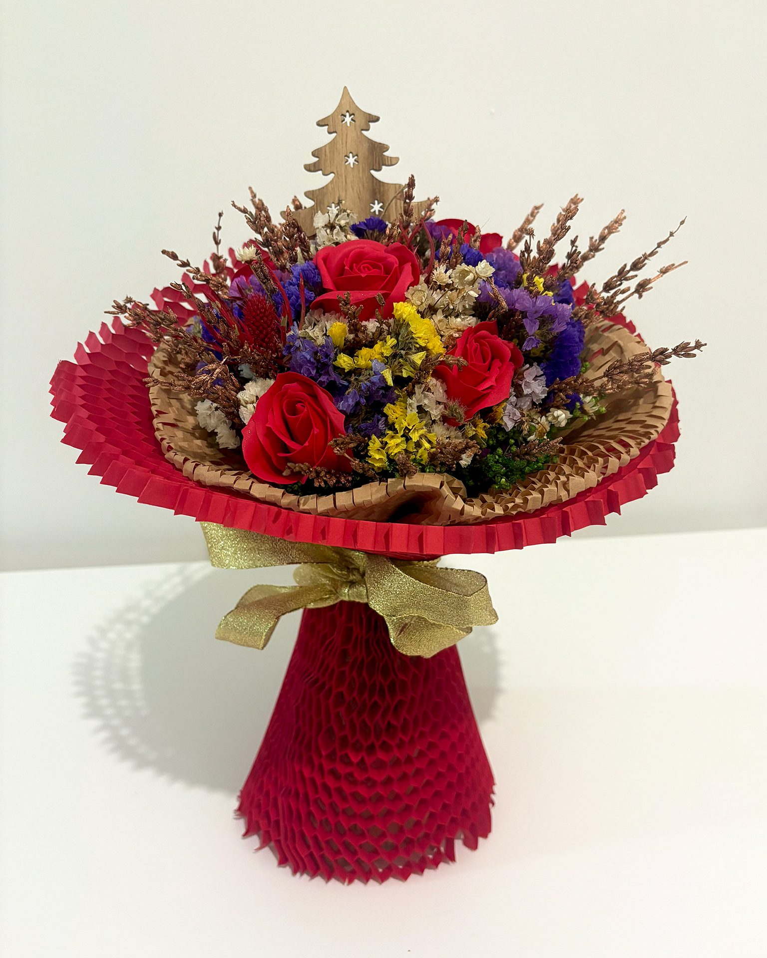 Rosas vermelhas combinadas com flores secas em tons de roxo, amarelo e azul. Embrulho frisado em vermelho e dourado e um aplique de árvore de Natal em madeira.