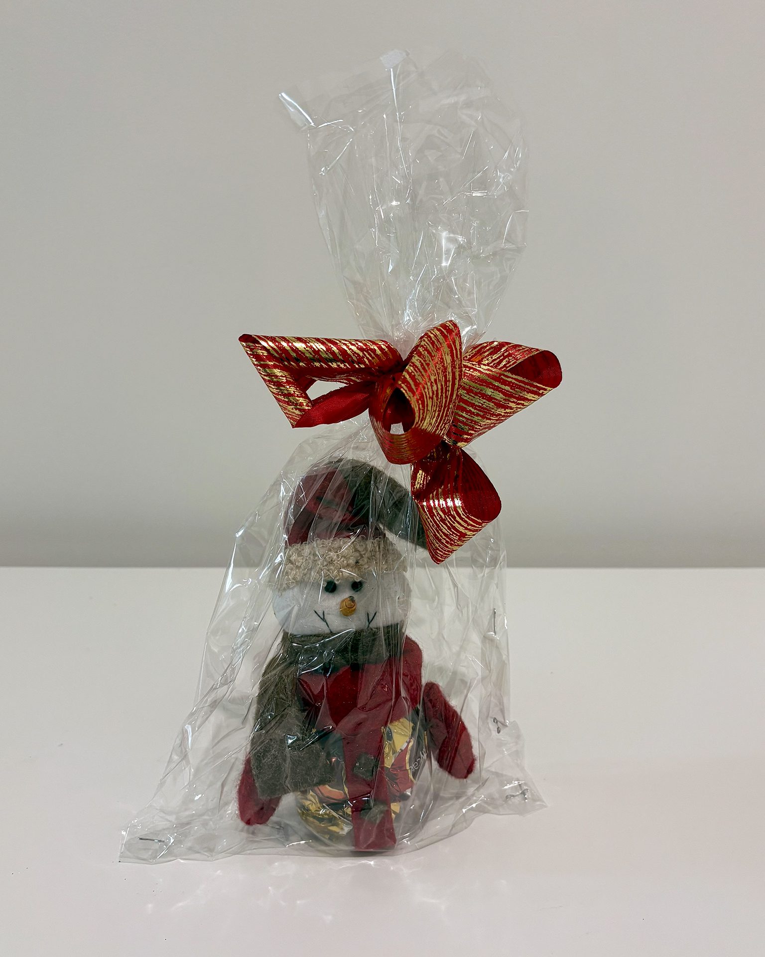 Um pequeno presente temático com um mini-Boneco de Neve de pelúcia, recheado com guloseimas/chocolates. Perfeito como miminho ou lembrança.